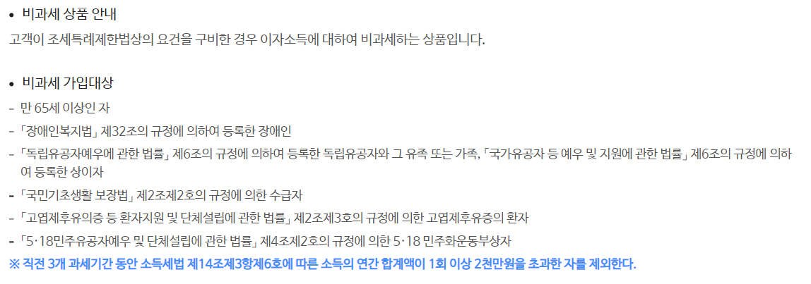 우리WON CMA Note 상품 세제혜택은 다음과 같습니다. 본인 한도 내에 비과세종합저축 가입이 가능합니다.